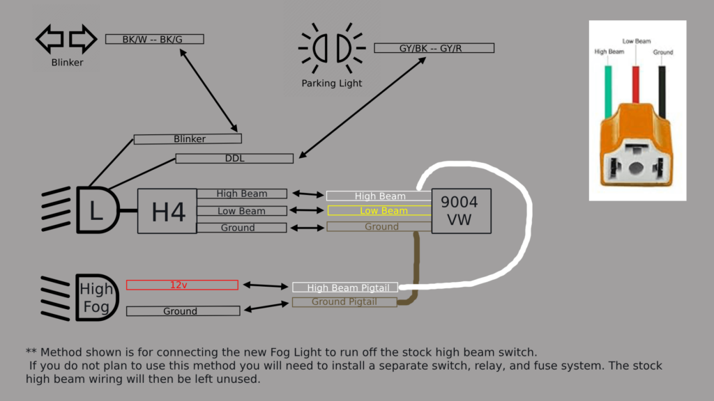 The new headlight comes with an integrated high beam, so the old high beam wiring is not needed. Given that the Fog Light are more like a super High Beam, some users of the kit have chosen to wire their fog lights into the left over high beam socket. This way when they turn their high beams, the fog come on also.